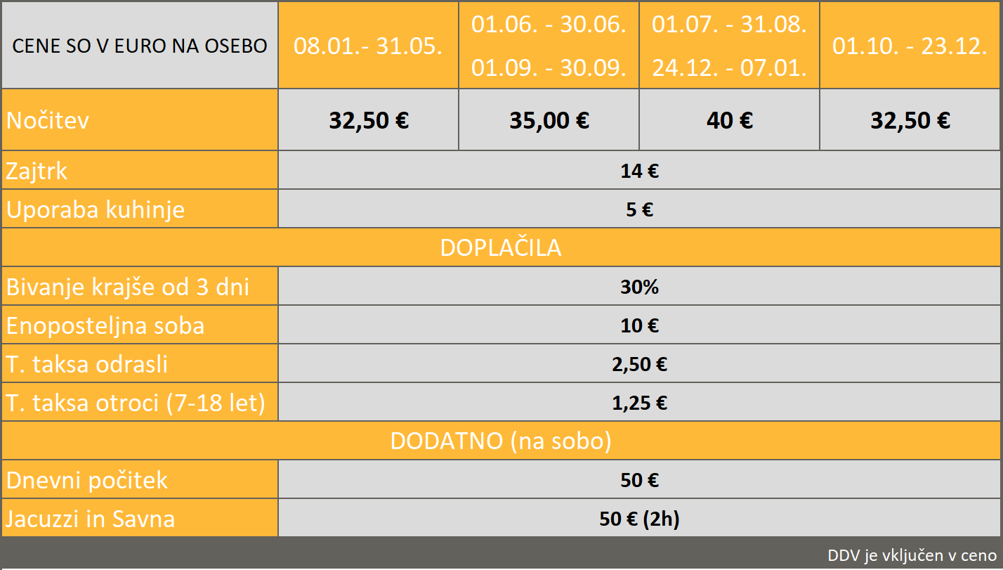 Naša namestitev je odprta vse dni v letu, pripravljena na vaše aktivnosti in sprostitev v vseh letnih časih.